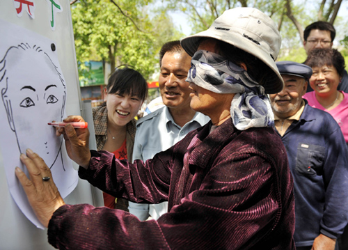 5月20日,74歲的康月蘭老人和社區(qū)居民在做畫鼻子游戲。當日,烏魯木齊市杭州路街道振興社區(qū)組織轄區(qū)內(nèi)的部分殘疾人士和老人來到市植物園賞花、游園、做游戲,社區(qū)干部用這種特殊的形式為他們送去關愛與祝福。
