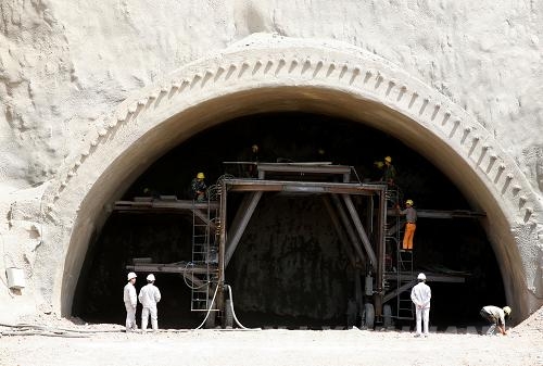 5月10日,建設(shè)者在蘭新鐵路第二雙線新疆哈密段一隧道工地施工。