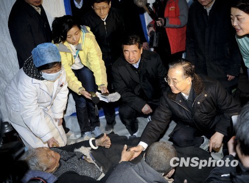 4月15日20時,中國國務院總理溫家寶來到青海省玉樹縣玉樹自治州醫(yī)院看望受災民眾。這是溫家寶握著一位藏族大媽的手問候其身體情況。 中新社發(fā) 廖攀 攝