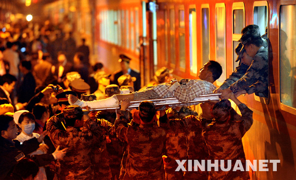 4月24日晚,救護(hù)人員在搬運(yùn)傷員。當(dāng)晚,由鐵路轉(zhuǎn)運(yùn)至西安的首批82名傷員乘坐“救2”次專列抵達(dá)西安,傷員們將在西安接受專業(yè)救治。這趟專列是青藏鐵路公司開行的第一趟轉(zhuǎn)運(yùn)傷員專列。新華社記者 陶明 攝