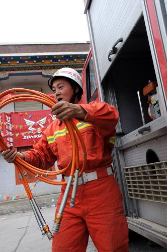 這是個(gè)只有15歲大的藏族小女孩。消防隊(duì)員立即將她抬上救護(hù)車。