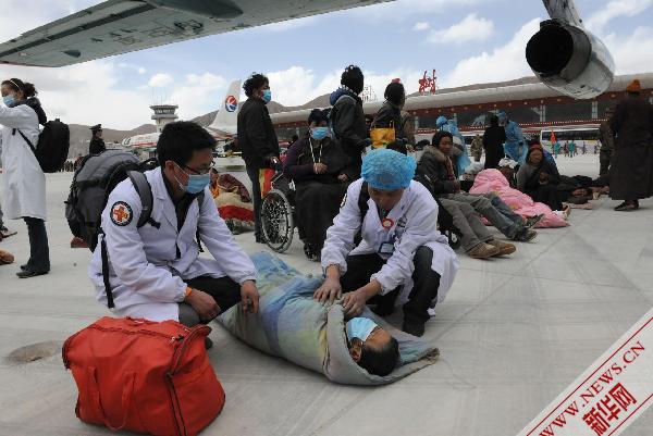 4月19日,傷員在玉樹巴塘機場等待轉運。記者從青海玉樹抗震救災指揮部了解到,截至4月18日8時,已有1881名地震傷員從玉樹災區(qū)轉運到省內(nèi)和外省醫(yī)療機構救治。新華社記者何俊昌 攝