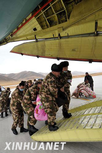 深圳邊防支隊(duì)抗震救災(zāi)醫(yī)療小分隊(duì)抵達(dá)玉樹開展救援。4月15日,在青海玉樹機(jī)場(chǎng),深圳邊防支隊(duì)抗震救災(zāi)醫(yī)療隊(duì)隊(duì)員將傷員轉(zhuǎn)移上飛機(jī)。當(dāng)日13時(shí)許,廣東深圳邊防支隊(duì)抗震救災(zāi)醫(yī)療小分隊(duì)抵達(dá)青海玉樹機(jī)場(chǎng),恰逢災(zāi)區(qū)一批傷員被轉(zhuǎn)移到機(jī)場(chǎng)準(zhǔn)備送往西寧等地救治。醫(yī)療小分隊(duì)得到消息后立即投入到轉(zhuǎn)移、救治傷員的工作中。新華社發(fā)(陳森陽 攝)