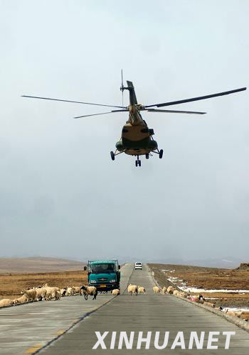 4月16日,一架直升機飛越214國道上空,奔向玉樹。目前,來自全國各地的大批救援物資正源源不斷地向地震災(zāi)區(qū)輸送。214國道西寧至玉樹的800余公里公路成為向災(zāi)區(qū)輸送物資的生命線。記者歷時15個小時,從西寧乘車前往玉樹,目擊了這條生命線的繁忙景象。新華社記者 丁海濤 攝