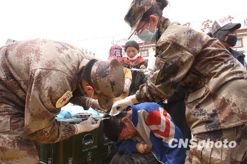 4月17日,青海省玉樹藏族自治州玉樹縣地震發(fā)生第四天,地震災(zāi)區(qū)各個救援點及時醫(yī)治受災(zāi)民眾。 中新社發(fā) 郭國權(quán) 攝