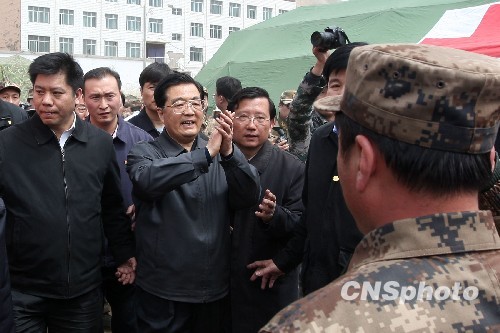 4月18日,中共中央總書記、國家主席、中央軍委主席胡錦濤飛抵玉樹,看望慰問地震災(zāi)區(qū)干部群眾,實地指導(dǎo)抗震救災(zāi)工作。 中新社發(fā) 盛佳鵬 攝