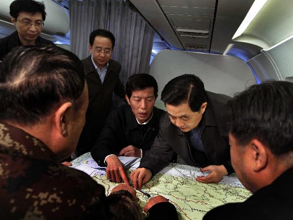4月18日,中共中央總書記、國家主席、中央軍委主席胡錦濤乘飛機前往玉樹地震災區(qū),看望慰問災區(qū)干部群眾,實地指導抗震救災工作。胡錦濤在飛機上察看玉樹災區(qū)地圖(4月18日攝)。 新華社記者蘭紅光攝