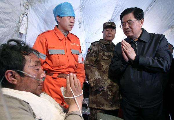 4月18日,中共中央總書記、國家主席、中央軍委主席胡錦濤在玉樹州體育場醫(yī)療救助點看望受災群眾(4月18日攝)。 新華社記者蘭紅光 攝