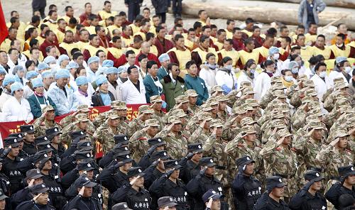 同日上午10時(shí),在青海省省會(huì)西寧市新寧廣場(chǎng),萬余名各界各族群眾聚集在一起,深切悼念玉樹地震遇難同胞。