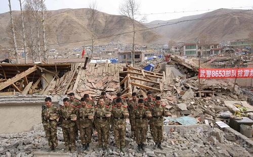 4月21日,青海玉樹“4·14”地震災(zāi)區(qū)舉行哀悼活動(dòng),沉痛悼念地震遇難同胞。在玉樹結(jié)古鎮(zhèn),參與抗震救災(zāi)的武警官兵在廢墟旁為地震遇難同胞默哀。新華社記者周磊攝