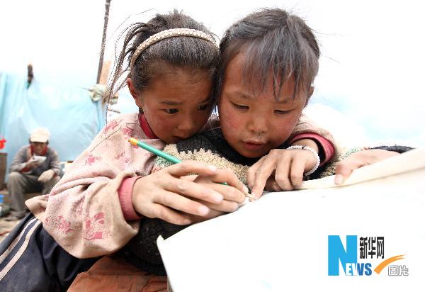 4月21日,俄德才仁的女兒成林巴措(左)在教妹妹認(rèn)字。 家住玉樹結(jié)古鎮(zhèn)扎西大同村的俄德才仁在地震中失去了自己的妻子和遮風(fēng)避雨的家,如今剩下6個未成年的孩子需要他一人獨立撫養(yǎng)。俄德才仁現(xiàn)在最大的愿望就是把房子的廢墟清理出來,在上面重新建起自己的家。 “估計什么時間能夠把這房子建起來?”記者問俄德才仁,“應(yīng)該會很快,因為政府會幫助我們! 新華社記者 費茂華 攝