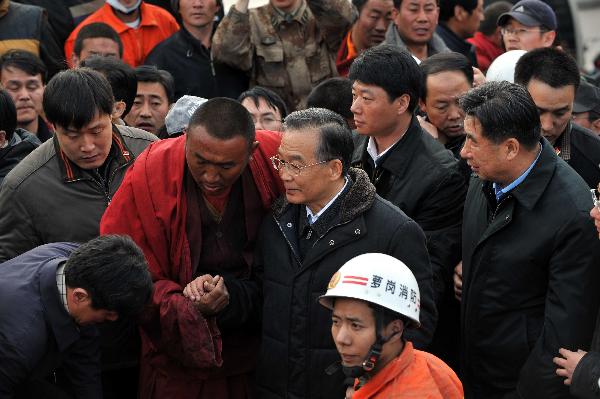 這是溫家寶在青海省玉樹縣結(jié)古鎮(zhèn)看望慰問災(zāi)區(qū)群眾。 新華社記者王鵬攝