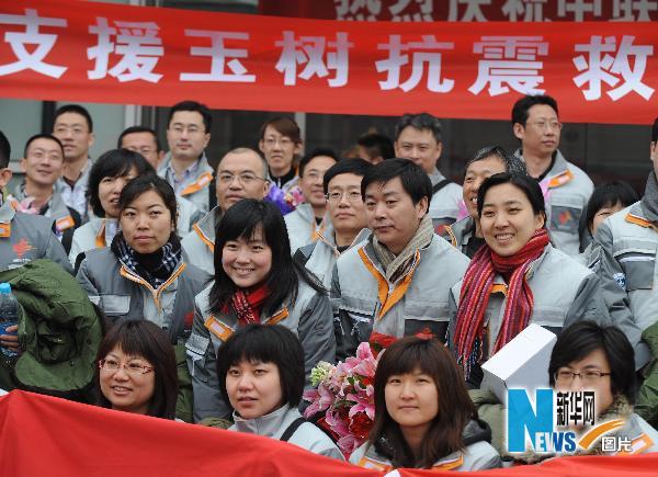 4月15日,醫(yī)療隊(duì)員臨行前在北京南苑機(jī)場合影。當(dāng)日,北京第一批急救醫(yī)療隊(duì)趕赴青海玉樹地震災(zāi)區(qū)開展救援。急救醫(yī)療隊(duì)由來自北京大學(xué)第一醫(yī)院、北京大學(xué)第三醫(yī)院、北京大學(xué)人民醫(yī)院、北京積水潭醫(yī)院、北京朝陽醫(yī)院、北京兒童醫(yī)院和北京急救中心的60余名醫(yī)護(hù)人員組成,包括臨床骨科、普外、腦外、腎內(nèi)、胸外等專業(yè),同時(shí)攜帶近8噸的急救物資和生活用品。新華社記者李文攝