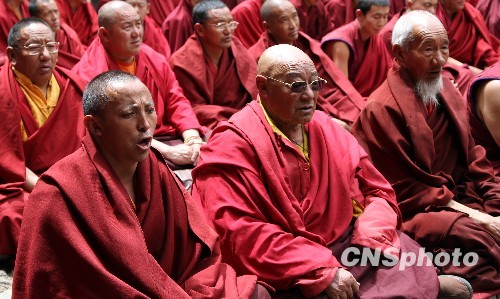 4月17日,拉薩大昭寺內(nèi),來自大昭寺、哲蚌寺、色拉寺、甘丹寺等寺院的藏傳佛教僧人集體誦經(jīng),為青海玉樹災區(qū)同胞祈福。中新社發(fā) 徐長安 攝