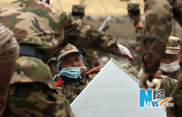 4月22日,武警戰(zhàn)士在幫助牧民鐵尕搬運從他家廢墟中清理出來的冰箱。新華社記者 費茂華攝
