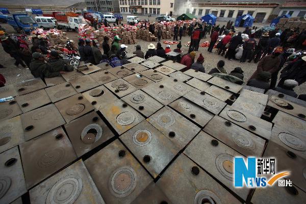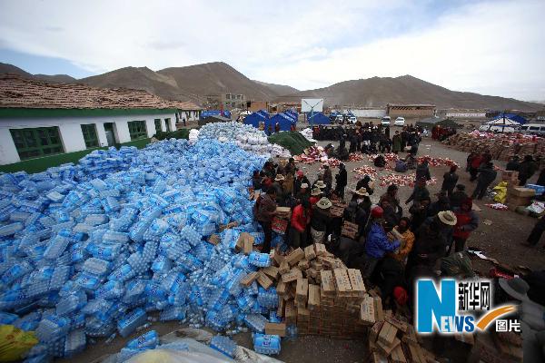 4月22日,牧民們將領到的救援物資分村擺放好。新華社記者費茂華攝