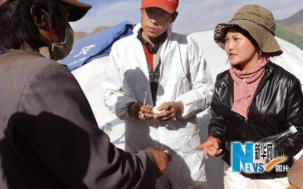 4月26日,家在結(jié)古鎮(zhèn)的西北師大學(xué)生朋措(右一)正向看病的藏族群眾翻譯醫(yī)生的用藥標(biāo)準(zhǔn)。