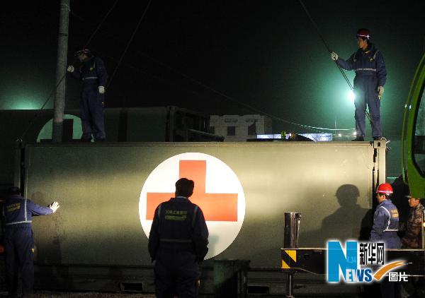 4月25日晚,在玉樹體育場安置點,重型起重機在吊運野戰(zhàn)醫(yī)院方艙。當(dāng)晚,徐工集團玉樹抗震救援隊與濟南軍區(qū)野戰(zhàn)方艙醫(yī)院合作,連夜吊運、調(diào)整現(xiàn)有方艙醫(yī)院格局。濟南軍區(qū)野戰(zhàn)方艙醫(yī)院自4月22日運抵玉樹災(zāi)區(qū),由于地域限制,一直無法發(fā)揮其最大功能。25日晚,該野戰(zhàn)方艙醫(yī)院連夜全面展開,預(yù)計將在午夜前全部布置完畢,完全不影響藏族群眾第二天就診。此后,該方艙醫(yī)院將一直保留在玉樹災(zāi)區(qū),直到當(dāng)?shù)蒯t(yī)院重建完成。新華社記者郭磊攝