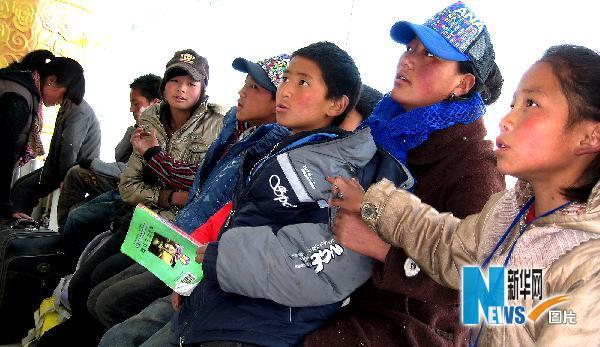 4月26日,玉樹縣少兒福利院的孩子們?cè)谟駱錂C(jī)場(chǎng)查看機(jī)場(chǎng)登機(jī)信息。當(dāng)日,青海省玉樹縣少兒福利院21名孤兒乘坐飛機(jī)赴西寧市。他們將開始在那里的學(xué)習(xí)生活。 新華社記者陳鋼攝