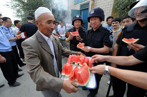 7月14日,居民阿米娜為特警隊(duì)員送上自己烤制的羊肉串。紅廟子平頂山是烏魯木齊市的一個多民族聚居區(qū)!7·5”打砸搶燒嚴(yán)重暴力犯罪事件發(fā)生后,在此執(zhí)勤的特警隊(duì)員們沉著冷靜地維護(hù)民族團(tuán)結(jié)、維護(hù)社會穩(wěn)定,及時化解民族矛盾,排除各種不穩(wěn)定因素;利用一切時機(jī)深入各族群眾中,挨家挨戶耐心做思想教育和民族政策宣傳工作,幫助居民及時認(rèn)清“7·5”事件真相和境外“三股勢力”挑起民族矛盾的險(xiǎn)惡用心。不懈努力,逐散陰霾,各民族居民又開始相互往來交流,平頂山又恢復(fù)了往日的融洽與寧靜。而這些維穩(wěn)使者們用行動和真誠贏得了民族聚居區(qū)群眾的信任,并與他們結(jié)下了深厚的友誼。新華社記者 李紫恒 攝