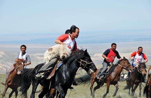 8月16日,選手們在激烈的叼羊比賽中。8月16日,一場由哈薩克和蒙古族牧民參加的叼羊比賽在新疆烏蘇市天山腳下的賽力克提牧場舉行。叼羊是哈薩克族傳統(tǒng)的體育項(xiàng)目,為了增進(jìn)各民族的團(tuán)結(jié)和友誼,豐富農(nóng)牧民群眾的精神文化活動(dòng),當(dāng)?shù)孛磕甓寂e辦蒙古族的那達(dá)慕大會(huì)、哈薩克族的叼羊比賽和姑娘追等少數(shù)民族傳統(tǒng)體育活動(dòng)。新華社發(fā)(江文耀 攝)