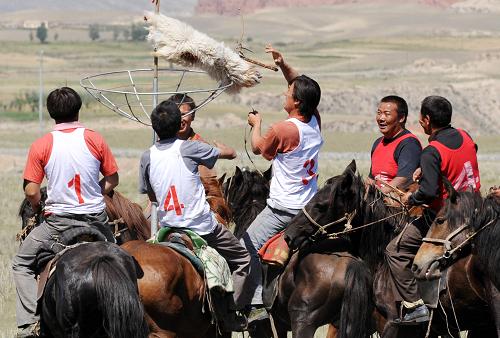 在叼羊比賽中,把羊扔進(jìn)“鍋”中的隊(duì)伍可得到1分(8月16日攝)。新華社發(fā)(江文耀 攝)