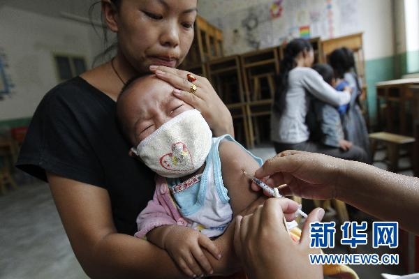 8月18日,在甘肅舟曲縣城獨(dú)立中學(xué)受災(zāi)群眾安置點(diǎn),醫(yī)務(wù)人員在為幼兒接種甲肝疫苗。鑒于舟曲災(zāi)區(qū)目前的衛(wèi)生和疾病預(yù)防形勢(shì),甘肅省、甘南藏族自治州、舟曲縣三級(jí)疾控中心自8月16日開始,為災(zāi)區(qū)1歲半至6歲的幼兒大面積接種甲肝疫苗,防止甲肝疾病的發(fā)生。截至8月18日12時(shí),已有約500名幼兒接種了甲肝疫苗。新華社記者 任正來(lái) 攝