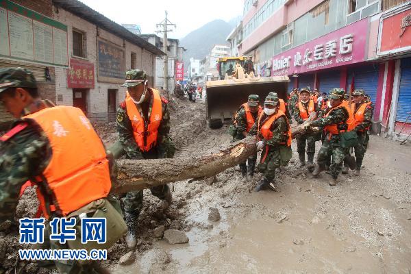 8月17日,在舟曲縣城主街道,武警甘肅森林總隊(duì)官兵在水電部隊(duì)大型機(jī)械配合下開(kāi)展清淤工作。當(dāng)日,甘肅舟曲特大山洪泥石流災(zāi)害搶險(xiǎn)救援進(jìn)入第十天,武警甘肅森林總隊(duì)官兵在江邊和縣城主要街道實(shí)施人工清淤。戰(zhàn)士們利用鐵鍬、鎬頭和推車(chē)等工具,全面清理泥沙和淤泥,并將部分泥濘的街道鋪上石子。新華社發(fā)(龐紅升 攝)