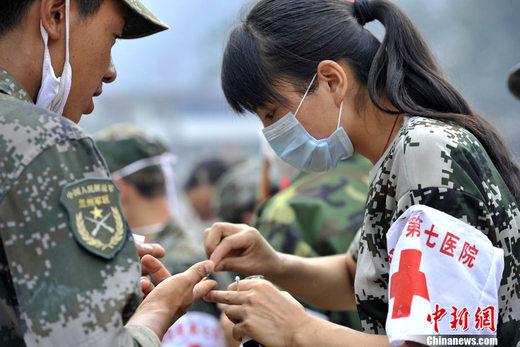 8月12日上午,甘肅舟曲災(zāi)區(qū)繼續(xù)下著小雨,解放軍第七醫(yī)院醫(yī)療隊的幾名女兵穿梭救援現(xiàn)場,幫助救援人員處理傷口。中新網(wǎng)記者 金碩 攝