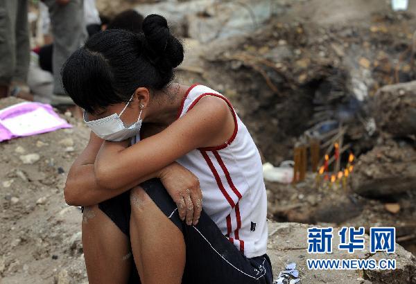8月12日,一位舟曲居民在親人遇難現(xiàn)場(chǎng)哭泣。當(dāng)日,許多遇難或失蹤者的家屬在舟曲縣城泥石流災(zāi)害現(xiàn)場(chǎng),祭奠親人,寄托對(duì)親人的無限哀思。 新華社記者 陶明攝