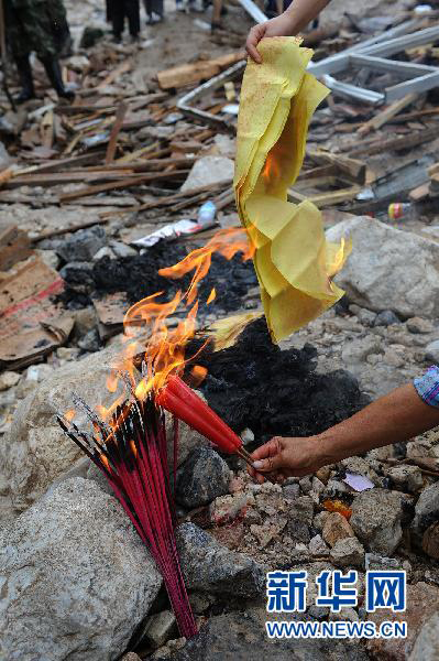 8月12日,遇難者親屬在災(zāi)害現(xiàn)場(chǎng)祭奠親人。當(dāng)日,許多遇難或失蹤者的家屬在舟曲縣城泥石流災(zāi)害現(xiàn)場(chǎng),祭奠親人,寄托對(duì)親人的無限哀思。 新華社記者 陶明攝