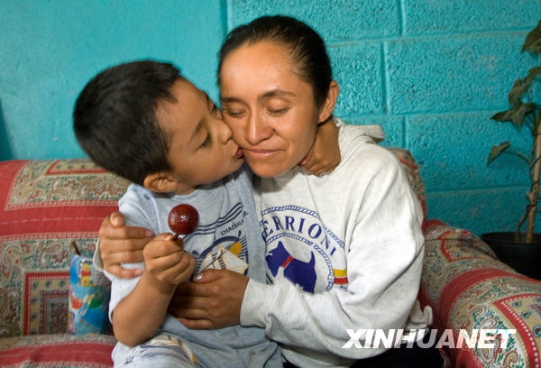 5月8日,在墨西哥韋拉克魯斯州拉格洛利亞村,墨西哥首位人感染甲型H1N1流感患者埃德加·恩里克·埃爾南德斯在家親吻媽媽瑪麗亞。