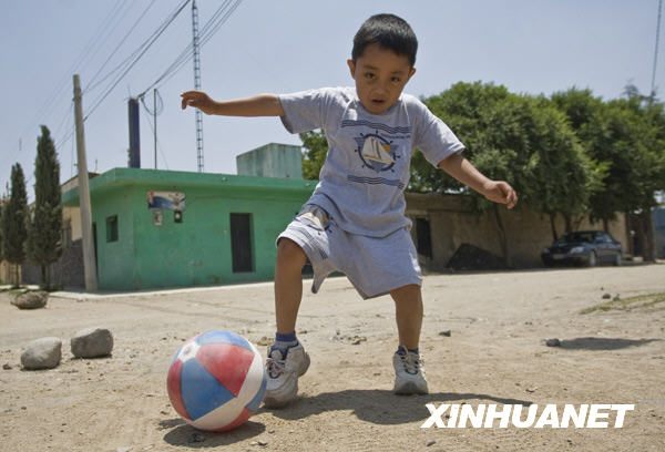 5月8日,在墨西哥韋拉克魯斯州拉格洛利亞村,墨西哥首位人感染甲型H1N1流感患者埃德加·恩里克·埃爾南德斯在家門口玩耍。新華社發(fā)(戴維攝)