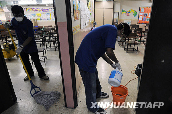 5月13日,在巴拿馬首都巴拿馬城,工作人員在一所學(xué)校的教室里擦地并消毒。當(dāng)天,巴拿馬新增4例甲型H1N1流感確診病例。新華社/法新
