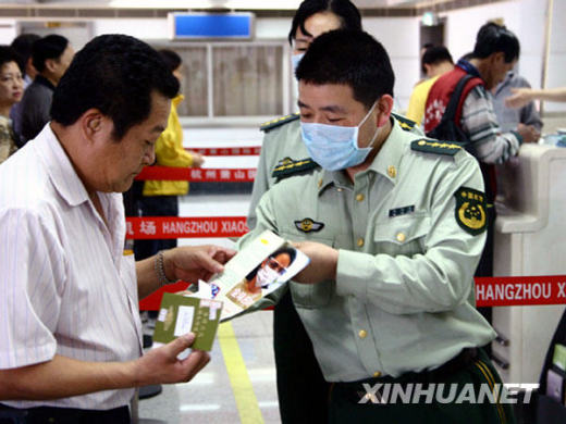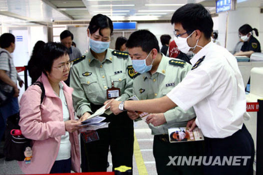 5月13日,在杭州蕭山國際機場,工作人員向入境旅客發(fā)放甲型H1N1流感防治宣傳材料。近期,杭州邊防檢查站、檢驗檢疫局駐機場辦事處聯(lián)合啟動應急機制,嚴防甲型H1N1流感流入。新華社發(fā)(范加龍 攝)