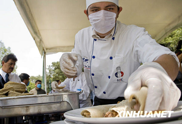 5月14日,在墨西哥首都墨西哥城舉行的新聞發(fā)布會(huì)上,廚師在制作玉米餅卷豬肉。墨西哥勞工部在當(dāng)天舉行的新聞發(fā)布會(huì)上表示,吃豬肉或者豬肉制品是安全的,不會(huì)有感染甲型H1N1流感的風(fēng)險(xiǎn)。目前墨西哥市場(chǎng)上豬肉價(jià)格穩(wěn)定,銷售情況良好。新華社發(fā)(戴維攝)