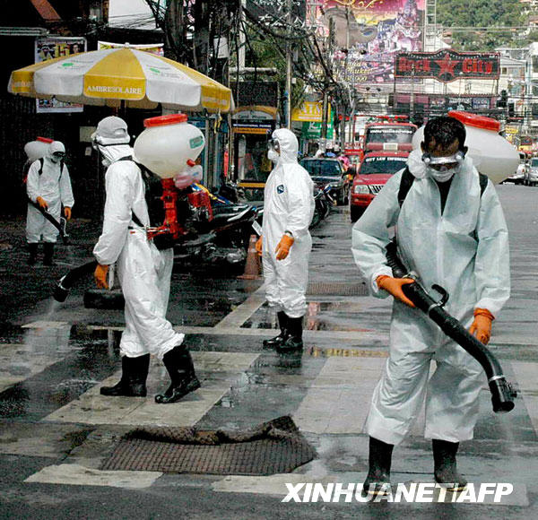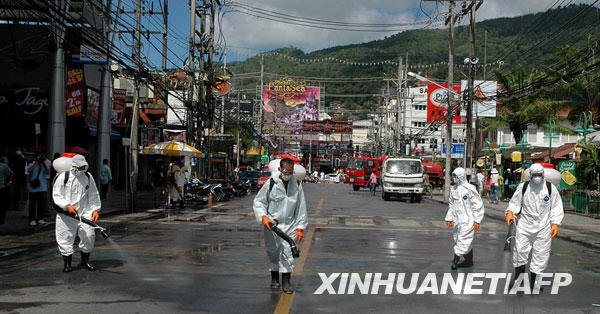 6月14日,工作人員在泰國普吉島的一條街道上噴灑消毒劑,以防范甲型H1N1流感疫情。截至北京時間6月15日14時,世界衛(wèi)生組織共確認泰國甲型H1N1流感確診病例8例。新華社/法新
