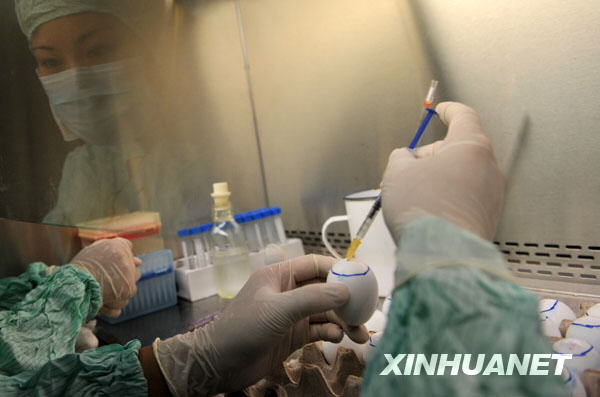6月17日,研究人員對(duì)兩支甲型H1N1流感疫苗生產(chǎn)用毒株進(jìn)行接種培養(yǎng)。