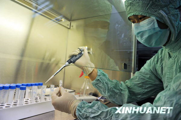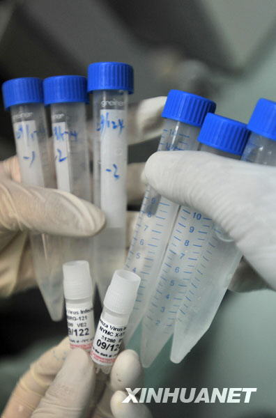 當(dāng)日,由衛(wèi)生部批準(zhǔn)、經(jīng)由世界衛(wèi)生組織提供的6支甲型H1N1流感疫苗生產(chǎn)用毒株運(yùn)抵武漢生物制品研究所,并于當(dāng)天上午在該所實(shí)驗(yàn)室進(jìn)行擴(kuò)增培養(yǎng)。7月底,將生產(chǎn)出疫苗原液,經(jīng)過動(dòng)物實(shí)驗(yàn)和臨床I、II期實(shí)驗(yàn)后,國慶節(jié)前有望生產(chǎn)出疫苗。新華社發(fā)(周超 攝)