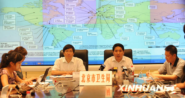 5月24日,北京市疾控中心主任鄧瑛(右二)、北京市疾控中心傳染病地方病控制所所長王全意(右三)在新聞發(fā)布會上介紹情況。當(dāng)日21時,北京市衛(wèi)生局通報,北京市報告一例甲型H1N1流感疑似病例,如果被確診,這將是北京市出現(xiàn)的第5位確診患者。