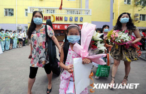 7月7日,解除觀察人員走出隔離區(qū)。當(dāng)日,北京朝陽(yáng)區(qū)南湖中園小學(xué)絕大部分密切接觸人員被解除為期7天的醫(yī)學(xué)觀察。7月1日,南湖中園小學(xué)首次確診7名學(xué)生感染甲型H1N1流感,衛(wèi)生部門將已查找的154名密切接觸者進(jìn)行集中醫(yī)學(xué)觀察。新華社記者 李文 攝