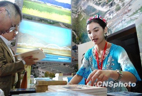 9月9日下午,維吾爾族姑娘凱迪日耶?阿卜來(lái)提(右)為參觀《內(nèi)蒙古、新疆、廣西、寧夏、西藏自治區(qū)成就展》的觀眾發(fā)放圖書資料。凱迪日耶是本次展覽新疆廳的講解員。 中新社發(fā) 侯宇 攝
