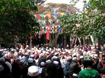 圣紀(jì)節(jié),阿拉伯語稱“冒路德節(jié)”,在每年六月八日進(jìn)行。相傳這天為穆罕默德的逝世日,亦稱“圣忌”。為緬懷其功德,舉行紀(jì)念活動,主要包括誦經(jīng)、贊圣和講述其生平事跡。當(dāng)日穆斯林前往清真寺聽教長、阿訇講經(jīng),然后游玩一天,有的還宰殺牛羊,設(shè)宴聚餐。
