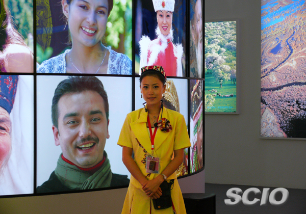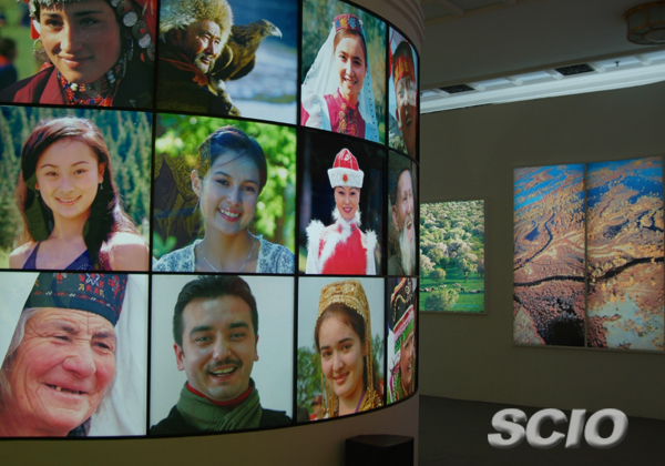 走進(jìn)展廳,一幅幅新疆美景映入眼簾。靜美的喀納斯湖、星羅棋布的山川河流……這些圖片構(gòu)成了展廳中一條美麗的長廊。長廊一側(cè)的大型照片布滿了世居新疆的13個民族各具特色的臉龐,燦爛的笑容洋溢在自治區(qū)各族同胞的臉上,給人無限的感動。維吾爾族、哈薩克族、達(dá)斡爾族、俄羅斯族、蒙古族、漢族……各族人民團(tuán)結(jié)一心,歡欣鼓舞。這些獨具匠心的設(shè)計,讓參觀者流連忘返。
