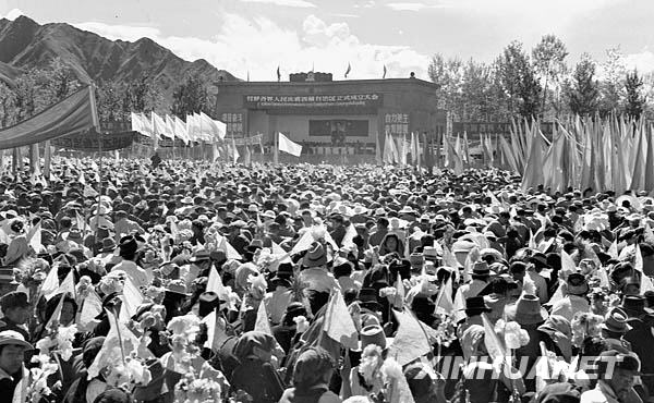 1965年9月,拉薩各界各族人民3萬多人舉行集會游行,熱烈慶祝西藏自治區(qū)成立(資料照片)。
