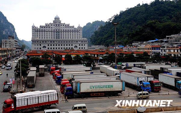 2008年11月19日,來自中國各地和越南的大型貨車在廣西憑祥口岸浦寨貿(mào)易區(qū)等待交易(資料照片)。