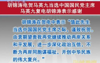 胡錦濤電賀馬英九當(dāng)選中國國民黨主席 馬英九復(fù)電表示感謝