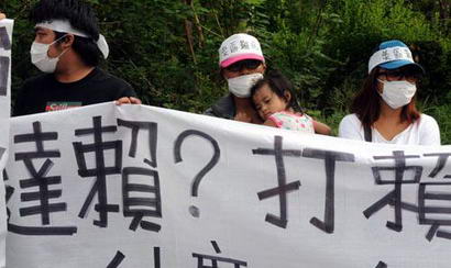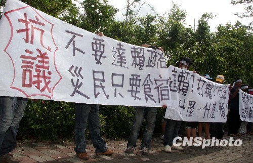 8月31日上午,來自屏東霧臺鄉(xiāng)等地的部分“88水災(zāi)”受災(zāi)民眾,打著橫幅在達(dá)賴?yán)锵麻降母咝凼猩徧稌^外抗議。中新社發(fā) 董會峰 攝