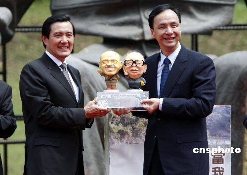 資料圖:2008年4月5日,馬英九為全臺最大的蔣中正銅像舉行再造重生揭幕,桃園縣長朱立倫(右)贈與“兩蔣”Q版公仔。 中新社發(fā) 杜洋 攝