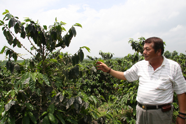 林文定向記者介紹農(nóng)場里的阿拉比卡咖啡樹(攝影 邵磌)